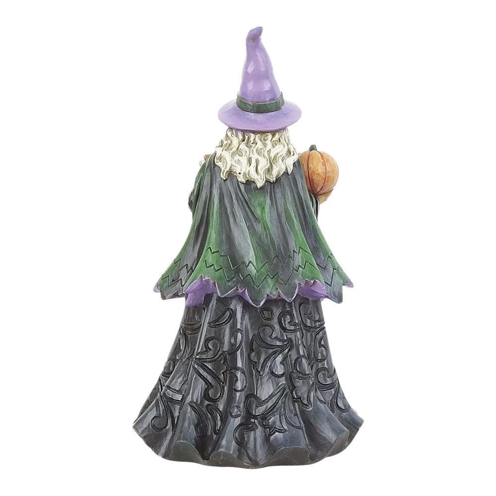 This spellbinding Jim Shore sorcerer holds a jack-o-lantern and potions book in her ghoulish grip. Wearing a witch’s hat patterned in stars, her purple cloak reveals a ghostly graveyard scene. A phantom dances in the magic made by the moonlight.