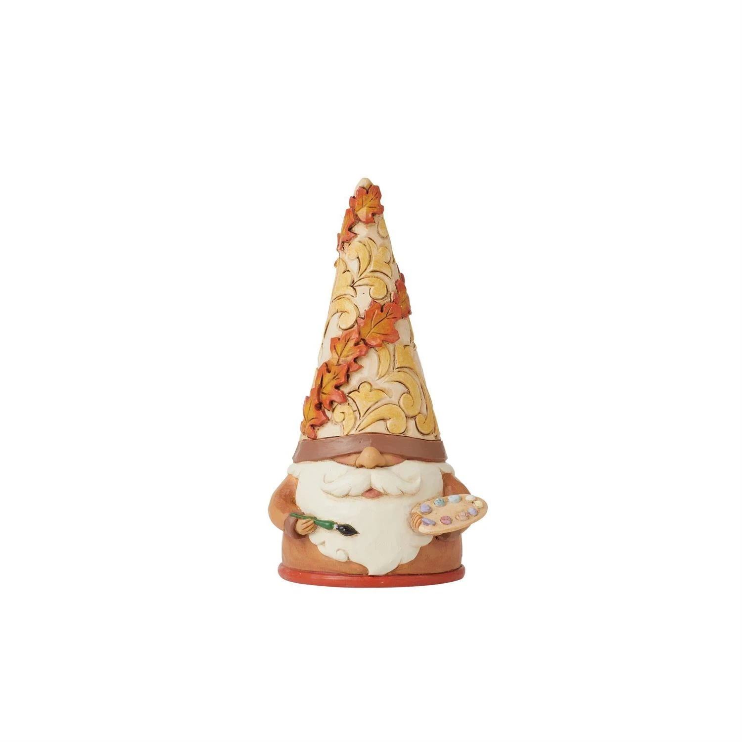 These playful seasonal gnomes are self-portrait styled sculptures of Jim Shore himself! The artist’s creations depict his favorite hobbies of each season. This Autumn gnome is fashioned in fall colors and leaves with a artist’s palette and brush.