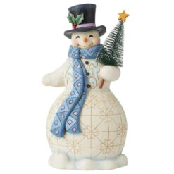 Holding a bottle brush tree, this snowman smiles warmly through any cold winter day. Wearing a top hat fitted with holly and decorated with classic Jim Shore rosemaling and patchwork patterns, this snowman makes a darling holiday decoration.