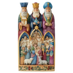 This Jim Shore centerpiece is an entrancing diorama of story. Three kings dress in regal robes to present gifts for the newborn king who sits inside a framed stage surrounded by angels, shepherds, and parents Mary and Joseph, in fantastic color.
