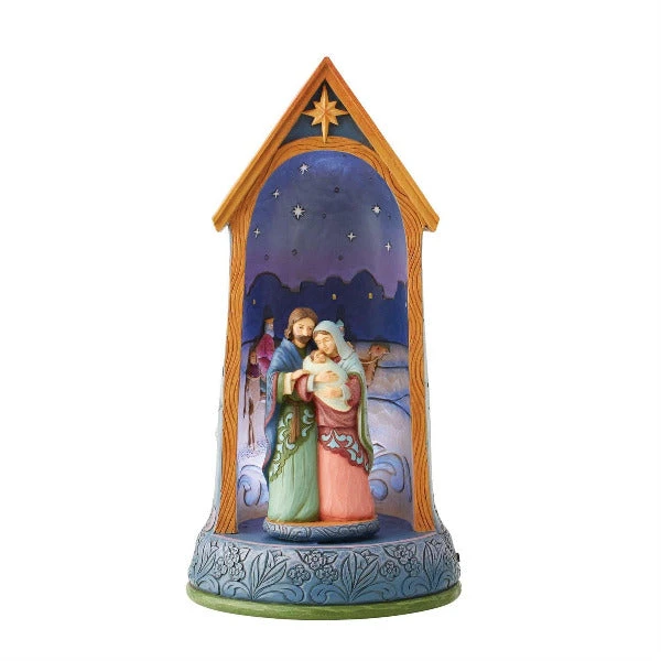 Jim Shores Holy Family figurine grace the front of the Three Kings’ midnight ride in backdrop. Features a battery-operated rotating base to reveal Angles and Shepard’s depicted on the other side. The lit interior scene illuminates the timeless story .